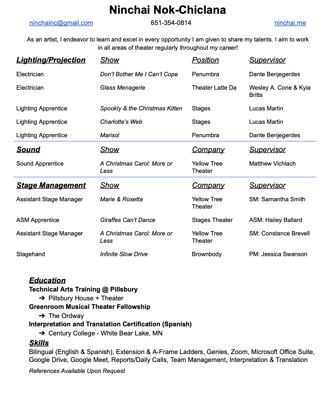 Ninchai is a performer, teacher, and cultural bearer of the Afro-Puerto Rican art of Bomba. She is a electrics & sound stagehand and Assistant Stage Manager as well as being a teacher/coach of the organizations Boriken Cultural Center, and El Arco Iris Center for the Arts.